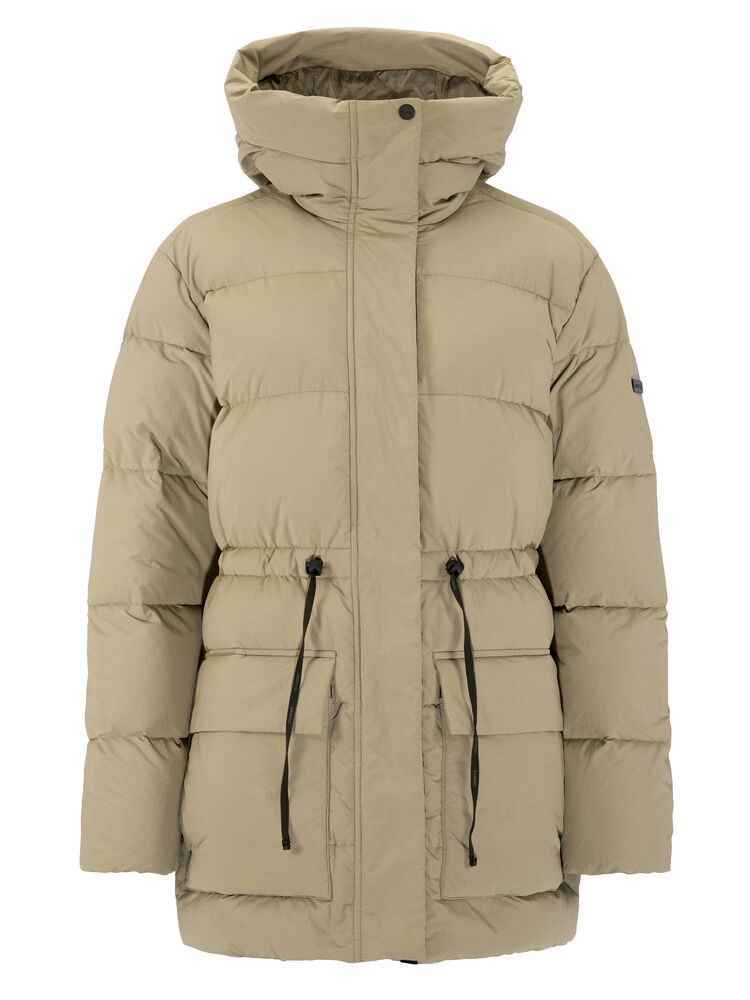 Denne stilfulde dynejakke er fremstillet til både fritid og formelle lejligheder og kombinerer funktionalitet med et minimalistisk udtryk. Det vandafvisende yderstof kombineret med tyk dunisolering giver enestående varme, når temperaturen falder. Derudover har jakken to rummelige håndvarmende lommer, en beskyttende hætte og en justerbar talje, der giver en skræddersyet pasform og en flatterende silhuet. Med et hoftelangt snit giver den ekstra dækning, mere varme og øget komfort på kølige vinterdage.